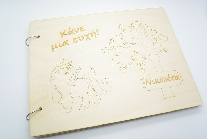 Βιβλίο ευχών βάπτισης με θέμα μονόκερος με ξύλινο εξώφυλλο χαραγμένο με laser. Η διάσταση του είναι 28.5 x 22 εκ και περιέχει 30 σελίδες. Μπορεί να γίνει σε ότι θέμα θέλετε καθώς και να χαρακτεί το όνομα του παιδιού σας.