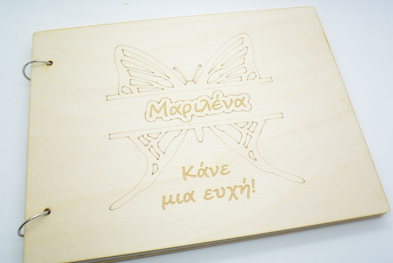 Βιβλίο ευχών βάπτισης με θέμα πεταλούδα με ξύλινο εξώφυλλο χαραγμένο με laser. Η διάσταση του είναι 28.5 x 22 εκ και περιέχει 30 σελίδες. Μπορεί να γίνει σε ότι θέμα θέλετε καθώς και να χαρακτεί το όνομα του παιδιού σας.