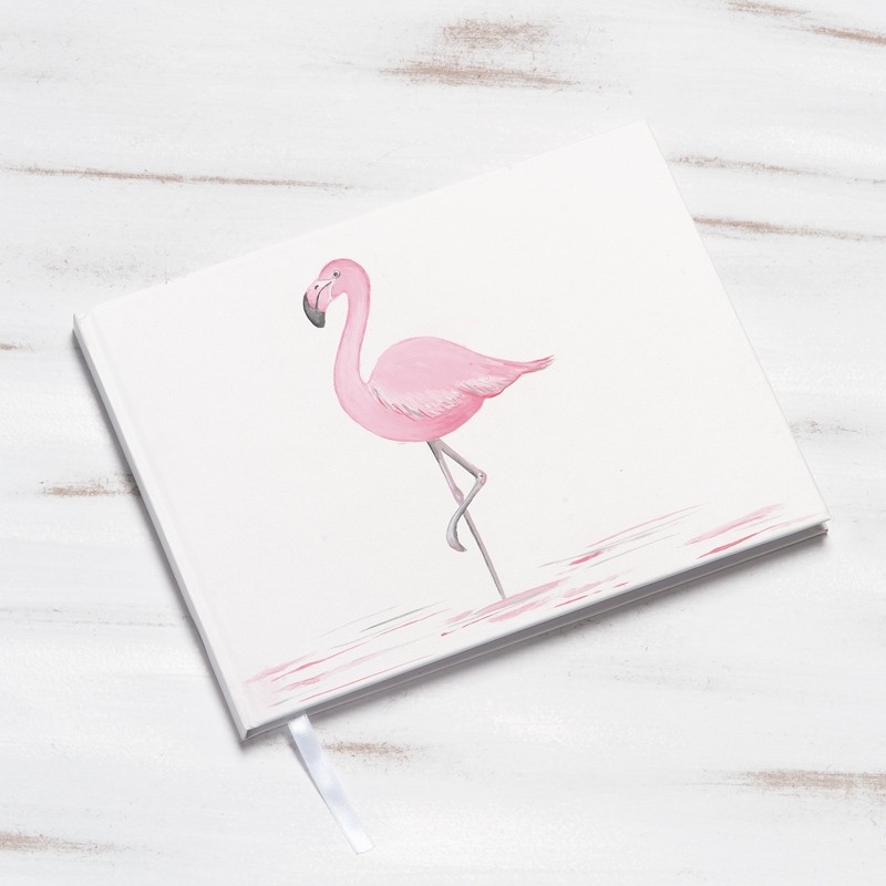 Βιβλίο ευχών λευκό εξωτερικά από χοντρό χαρτόνι, ζωγραφισμένο στο χέρι με flamingo ροζ