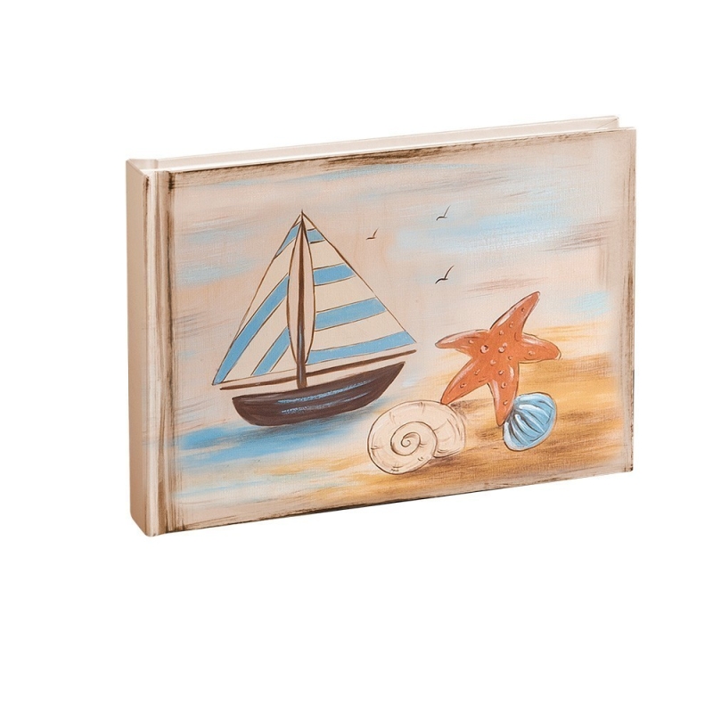 Βιβλίο ευχών λευκό εξωτερικά από χοντρό χαρτόνι,ζωγραφισμένο στο χέρι σε ναυτικό στυλ με καράβι σιέλ-καφέ,αστερία και κοχύλια, πάνω σε φόντο μπεζ με σβησίματα καφέ-σιέλ