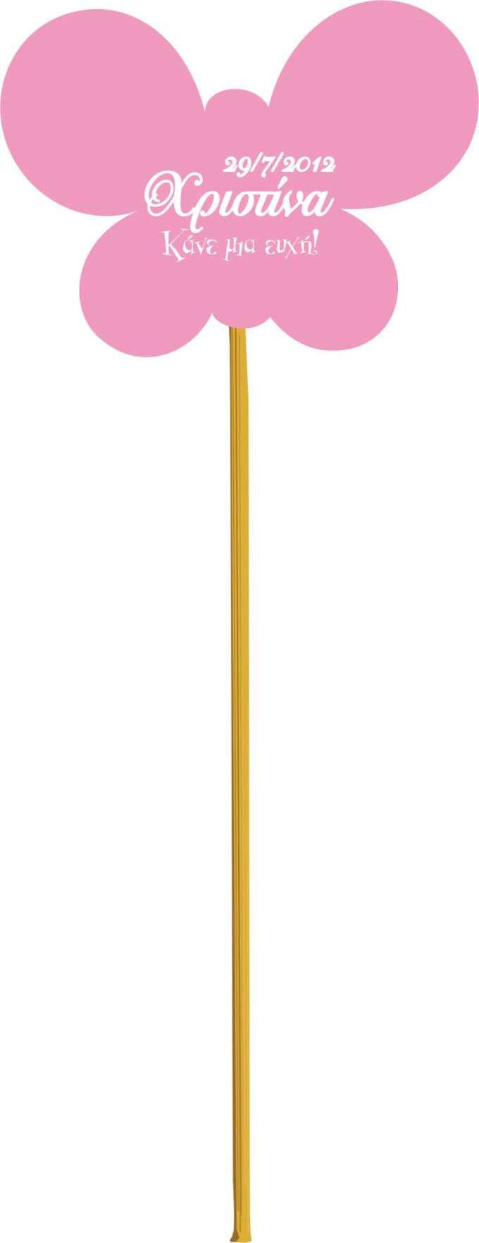 Ξύλινο Στικ πεταλούδα για διακόσμηση. Μπορεί να γίνει οποιαδήποτε θέμα και χρώμα επιθυμείτε. Το διακοσμητικό στην κορυφή έχει διάσταση 8cm το μέγεθος του stick είναι 20 cm.