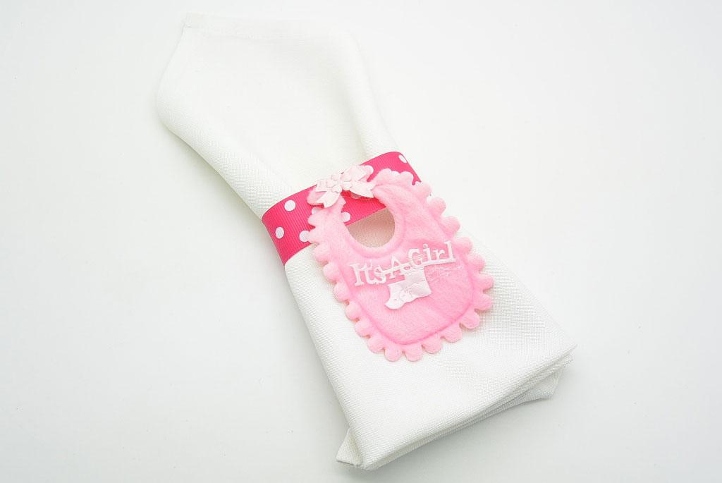 Στολισμός Πετσέτας ιδανικός για στολισμό βάπτισης με θέμα its a girl. Μπορεί να γίνει σε διάφορες αποχρώσεις. Η πάνινη σαλιάρα έχει διάσταση 10 cm x 7 cm.
