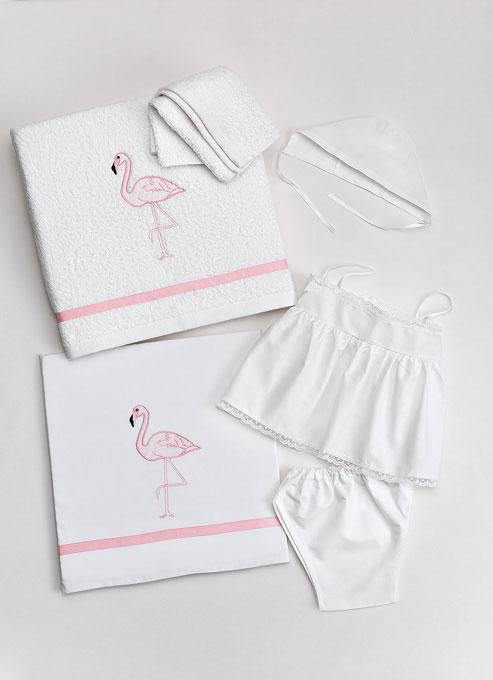 Λαδόπανα Βάπτισης με σχέδιο φλαμίνγκο ελληνικής κατασκευής άριστης ποιότητας βαμβακερά. Το σετ περιλαμβάνει πετσέτα μικρή και μεγάλη, σεντονάκι και σετ εσώρουχα.