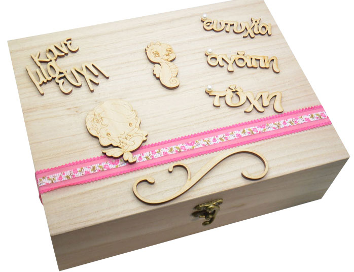 Ξύλινο Κουτί ευχών βάπτισης με θέμα γοργόνα. Διαστάσεις κουτιού 32 x 25 x 11 εκ. Μπορεί να συνδιαστεί με ξύλινες καρδιές με επιπλέον χρέωση.