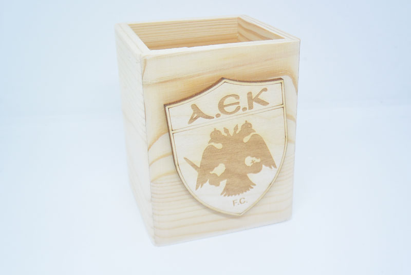 Μολυβοθήκη Ξύλινη με το σήμα της Άεκ με διάσταση 8 x 8 x 10 εκ. Μπορεί να γίνει για όλες της ομάδες. Η τιμή αφορά σκέτο το αντικείμενο.