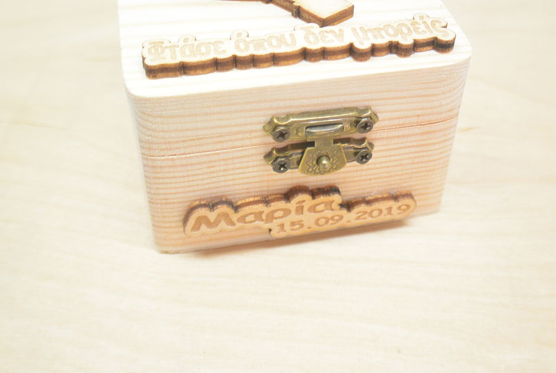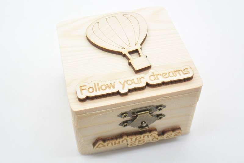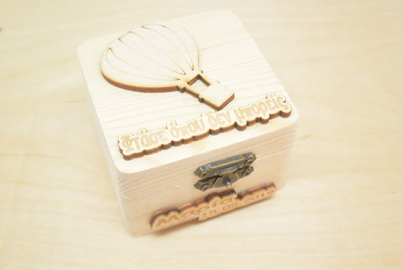 Ξύλινο κουτί μπομπονιέρα αερόστατο. Πάνω στο κουτάκι υπάρχει χαραγμένη η φράση ¨Φτάσε όπου δεν μπορείς¨ και στη βάση το όνομα του μωρού και η ημερομηνία βάπτισης. Διάσταση 8 x 8 x 5  cm.