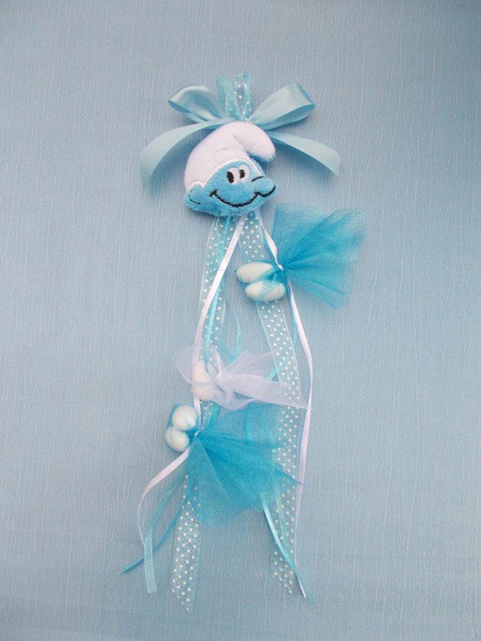 Μπομπονιέρα Βάπτισης στρουμφ φατσούλα κρεμαστή. Η τιμή περιλαμβάνει το δέσιμο της μπομπονιέρας με 5 κουφέτα αμυγδάλου. Διαστάσεις φατσούλας 6,5 cm.