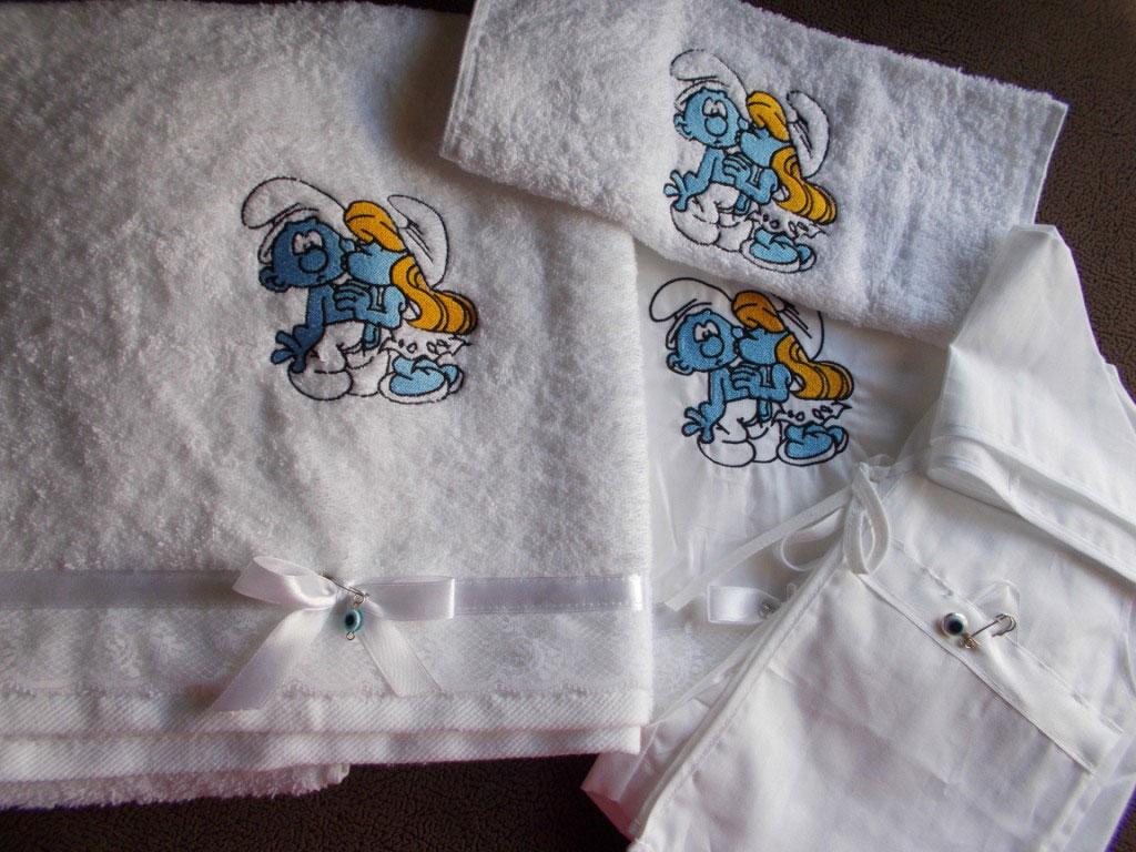 Λαδόπανα ελληνικής κατασκευής άριστης ποιότητας με τα στρουμφάκια. Μπορούμε να φτιάξουμε οποιαδηποτε φιγούρα θελετε. Το σετ περιλαμβάνει πετσέτα μικρή και μεγάλη, σεντονάκι και σετ εσώρουχα.