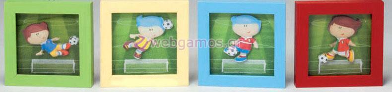 Μπομπονιέρα Βάπτισης ποδοσφαιριστής καδράκι. Στην τιμή περιλαμβάνεται το δέσιμο της μπομπονιέρας με 5 κουφέτα αμυγδάλου ή 9 κουφετάκια smarties. Διαστάσεις 11,5 εκ.