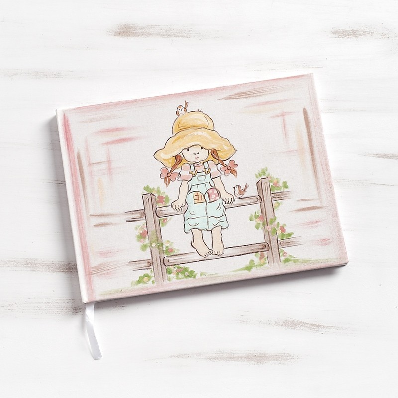 Βιβλίο ευχών λευκό εξωτερικά από χοντρό χαρτόνι, ζωγραφισμένο στο χέρι με τη Sarah Kay καθισμένη πάνω σε ένα φράχτη,περιτριγυρισμένη από λουλούδια.