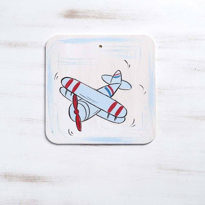 Ξύλινο τετράγωνο καδράκι με αεροπλάνο σιέλ, ιδανικό για διακοσμήσεις και κατασκευές