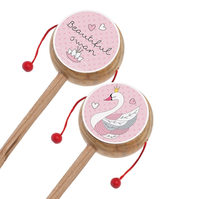 Ξύλινο natural τυμπανάκι με αυτοκόλλητο print κύκνος με διαφορετικό σχέδιο μπρος-πίσω.