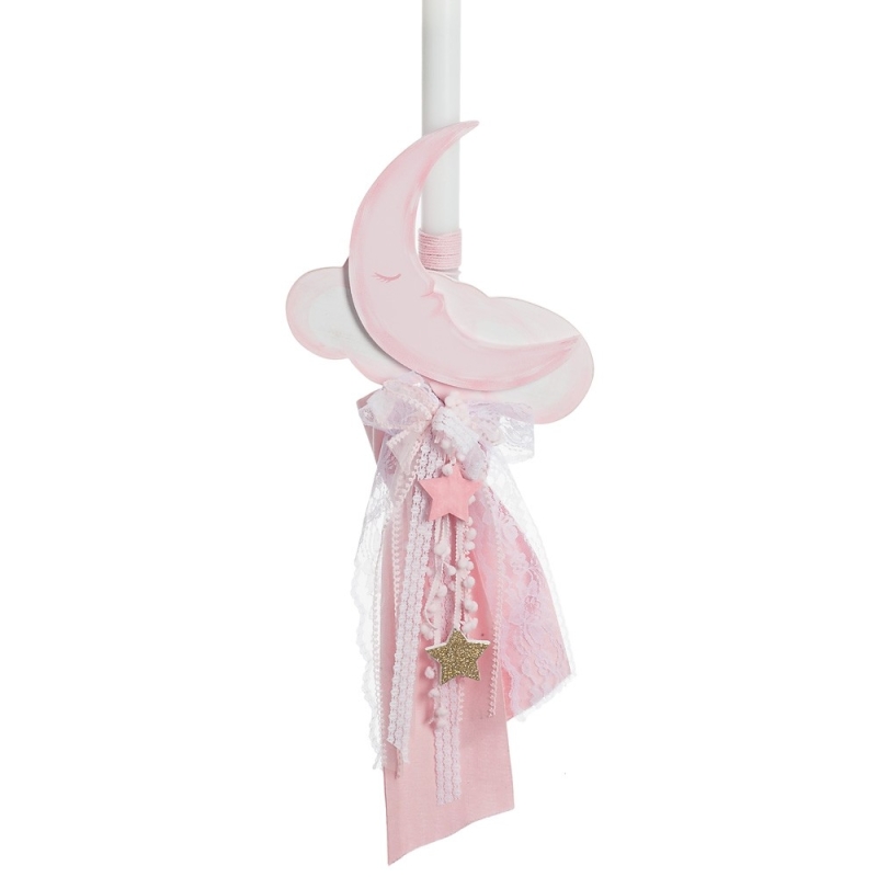 Λαμπάδα βάπτισης, δεμένη με κορδόνι ροζ και με ροζ βαμβακερό ύφασμα σε ατημέλητους φιόγκους. Στο πάνω μέρος είναι διακοσμημένη με ένα ροζ φεγγαράκι πάνω σε άσπρο σύννεφο ενώ από κάτω τους κρέμονται πολλές κορδέλες,κορδόνια με pom pom και δαντέλες σε λευκές αποχρώσεις και ξύλινα αστεράκια ροζ και χρυσά.