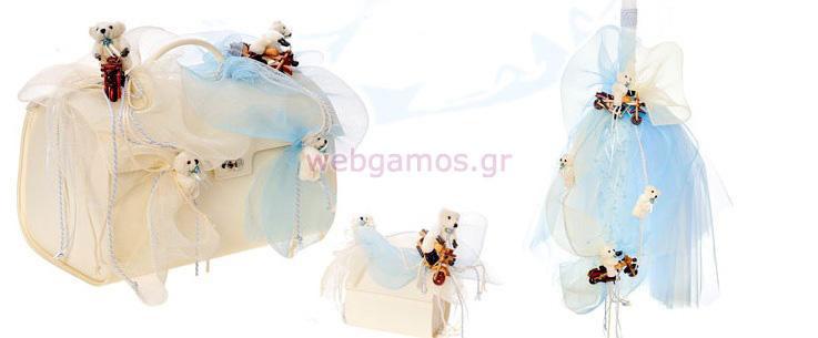 Οικονομικό Σετ βάπτισης με βαλίτσα βαπτιστικών στολισμένο σε εκρού - σιέλ  απόχρωση με αρκουδάκια. Η τιμή περιλαμβάνει βαλίτσα βάπτισης στολισμένη, βαλιτσάκι λαδικού στολισμένο, λαμπάδα βάπτισης στολισμένη, σετ λαδόπανα και εσώρουχα, σαπουνάκι και μπουκαλάκι για το λάδι στολισμένο και 3 κεράκια.