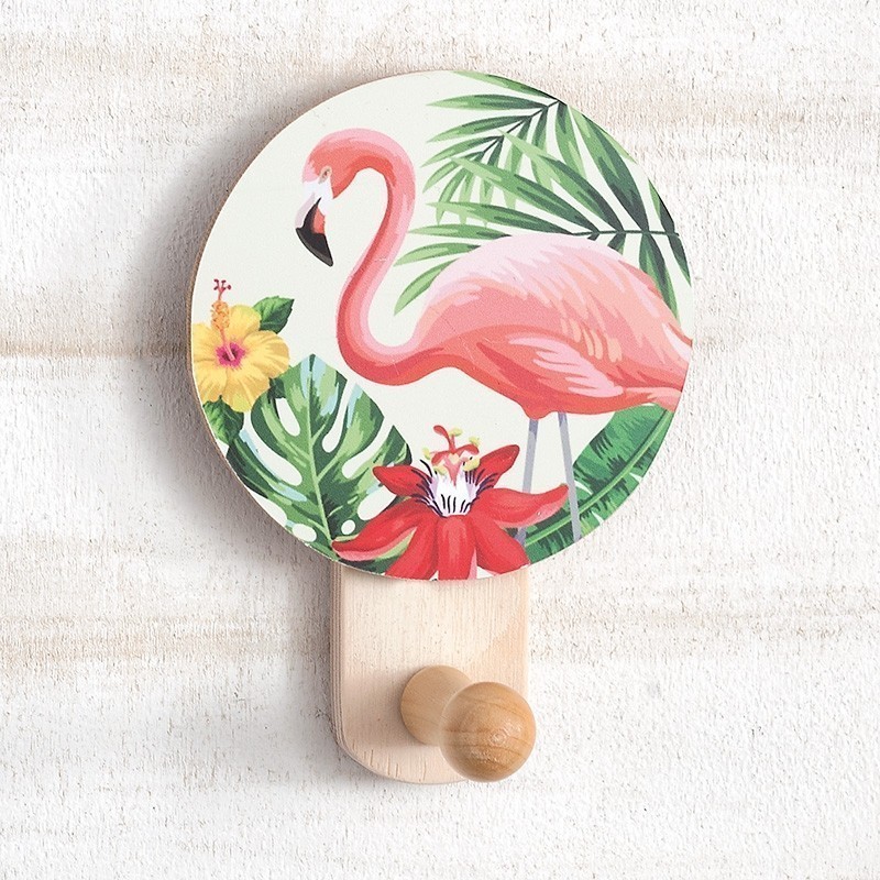 Ξύλινη natural κρεμάστρα τοίχου, διακοσμημένη με στρογγυλό κοπτικό flamingo.