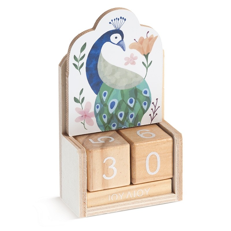 Ξύλινο ημερολόγιο με κύβους σε natural χρώμα. Διακοσμημένο με κοπτικό παγώνι.
