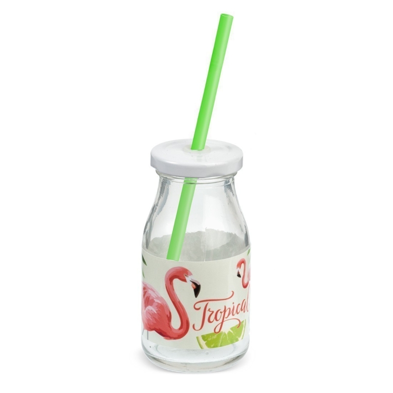 Γυάλινο μπουκάλι γάλακτος 200ml με λευκό μεταλλικό καπάκι. Συνοδεύεται από πολύχρωμα καλαμάκια. Είναι διακοσμημένο με αυτοκόλλητο print flamingo.