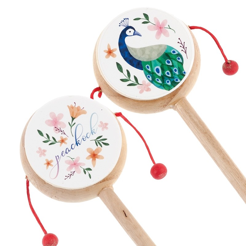 Ξύλινο natural τυμπανάκι με αυτοκόλλητο print παγώνι με διαφορετικό σχέδιο μπρος-πίσω.
