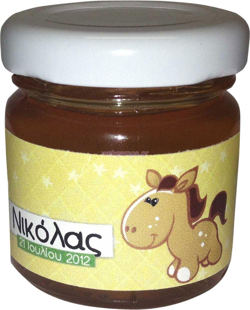 Βαζάκι με θέμα αλογάκι με μαρμελάδα της επιλογής σας. Η τιμή αφορά βαζάκι standard 40 ml. Μπορούμε να προσαρμόσουμε οποιο θέμα θέλετε.