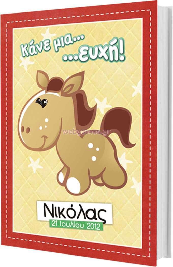 Βιβλίο ευχών με θέμα αλογάκι με διαστάσεις 30 x 21.5 cm. Ιδανικό για βάπτιση σε κοριτσάκι και αγοράκι. Μπορούμε να προσαρμόσουμε οποιο άλλο θέμα θέλετε.