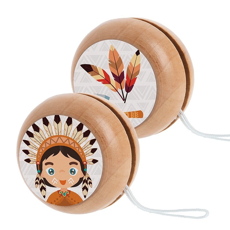 Ξύλινο natural γιο-γιο με σκοινάκι. Είναι διακοσμημένο με αυτοκόλλητο print ινδιάνος με διαφορετικό σχέδιο μπρος-πίσω.