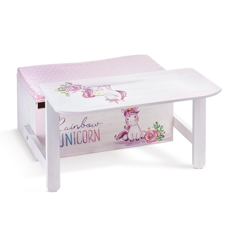 Ξύλινο λευκό παγκάκι-θρανίο,συσκευασία βάπτισης ζωγραφισμένη στο χέρι με θέμα τον μονόκερο.Το μπροστινό μέρος του κουτιού είναι ζωγραφισμένο με baby μονόκερο με πολύχρωμες αποχρώσεις στη χαίτη και την ουρά,ενώ δίπλα αναγράφεται η φράση "Rainbow Unicorn".Την πλάτη διακοσμούν πολύχρωμα συννεφάκια και αστεράκια ενώ το πίσω μέρος επίσης διακοσμεί ζωγραφιστός μικρός μονόκερος.Το κάθισμα του κουτιού διακοσμείται με μαξιλαράκι ντυμένο με ύφασμα ροζ με λευκά πουά.