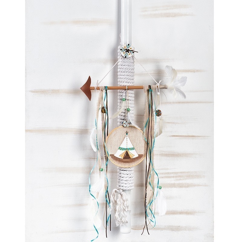 Λαμπάδα βάπτισης,δεμένη με κορδόνι λευκό και διακοσμημένη με ξύλινο βέλος,από το οποίο κρέμεται τελάρο κεντήματος από ξύλο και ύφασμα μπεζ.Πάνω στο ύφασμα υπάρχει ζωγραφιστή παράσταση με θέμα τη σκηνή του ινδιάνου με ethnic λεπτομέρειες, ενώ από το βέλος κρέμονται επίσης φτερά,κορδέλες και κορδόνια σε αποχρώσεις λευκές-μπεζ-καφέ και βεραμάν.