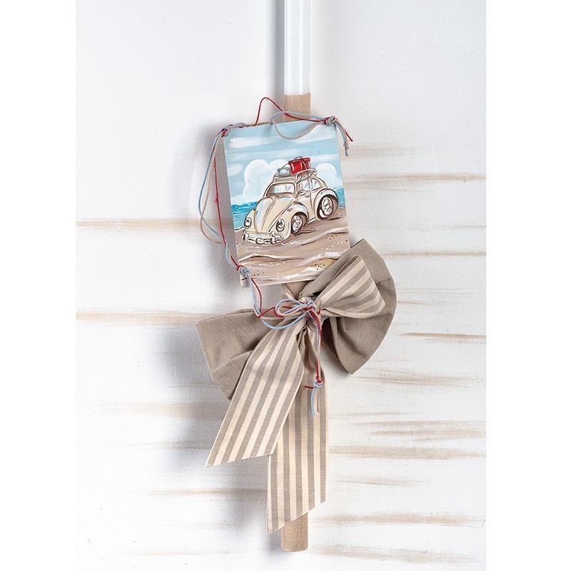 Λαμπάδα βάπτισης δεμένη με λινάτσα σε φυσική απόχρωση και διακοσμημένη με ξύλινο καδράκι ζωγραφιστό με σκαραβαίο το οποίο απεικονίζεται να είναι φορτωμένο με βαλίτσες δίπλα στη θάλασσα.Κάτω ακριβώς από το καδράκι διακοσμεί τη λαμπάδα διπλός βαμβακερός φιόγκος σε καφέ και ριγέ καφέ απόχρωση ενώ όλη η λαμπάδα διακοσμείται επιπλέον από κορδόνια καφέ-κόκκινο και σιέλ.