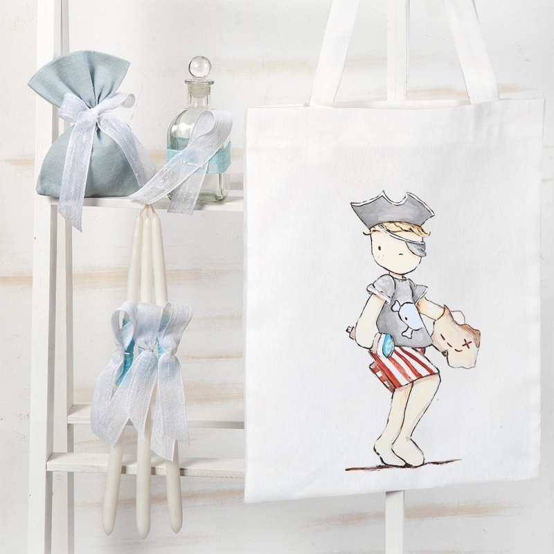 Ζωγραφιστή υφασμάτινη τσάντα με 3 κεριά,σαπούνι και μπουκάλι λαδιού στολισμένα σε σιέλ,λευκές αποχρώσεις. Η τσάντα είναι ζωγραφιστή στο μπροστινό κομμάτι με θέμα μικρός πειρατής.