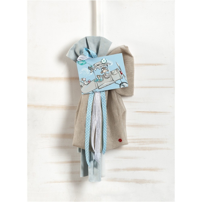 Λαμπάδα βάπτισης στολισμένη με δυο φιόγκους, ο σιέλ είναι βαμβακερός και ο καφέ-μόκα είναι από γάζα. Οι κορδέλες που έχουν χρησιμοποιηθεί είναι λινές. Το παραλληλόγραμμο καδράκι απεικονίζει το γκρι αεροπλάνο με τον μικρό πιλότο και την πραμάτια του.