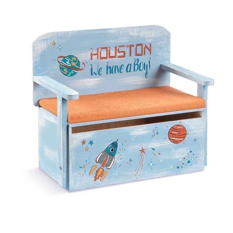 Ξύλινο κουτί βαπτιστικών παγκάκι που γίνεται θρανίο. Είναι σε brush σιέλ απόχρωση και απεικονίζει ζωγραφιστούς κομήτες, πλανήτες και πύραυλο.3,2,1..εκτοξευόμαστε.Στην πλάτη η φράση Ηouston we have a boy προϊδεάζει για την..διαστημική χαρά σε μια από τις πιο ιδιαίτερες μέρες της ζωής σας, την βάπτιση του παιδιού σας.