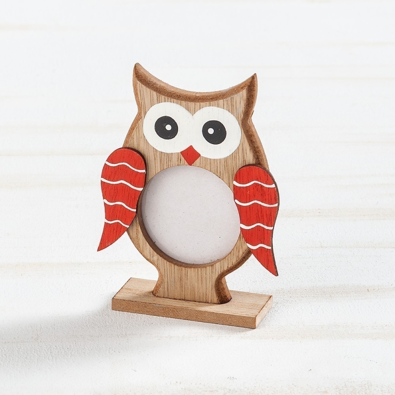 Ξύλινη διακοσμητική φωτογραφοθήκη σε σχήμα κουκουβάγιας σε natural χρώμα με πορτοκαλί λεπτομέρειες.