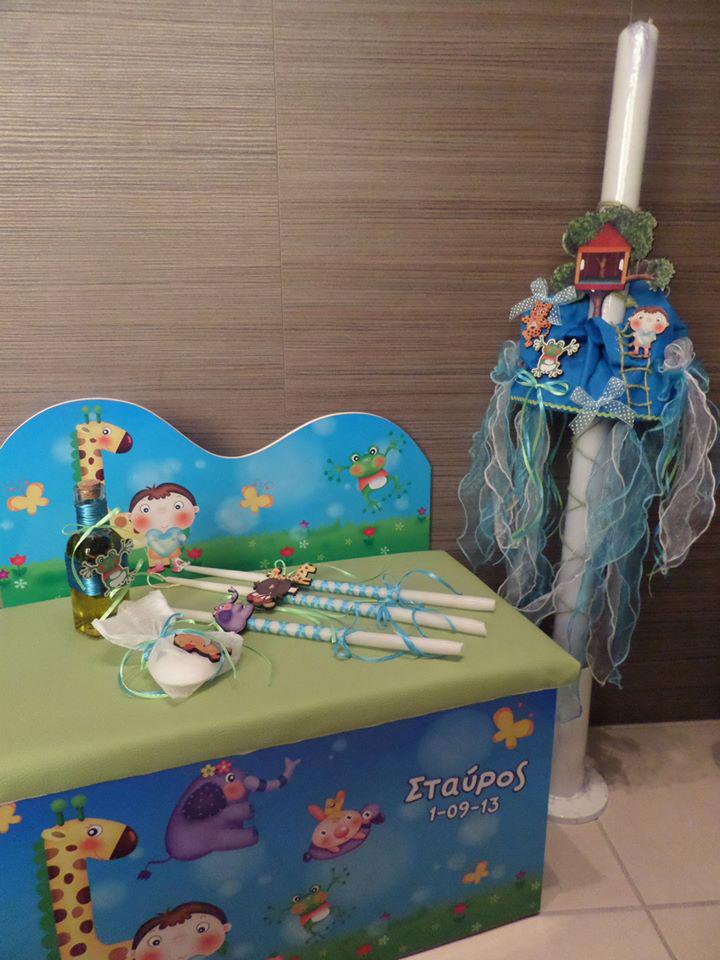 Σετ Βάπτισης διάφορα ζωάκια.  Το σετ περιλαμβάνει κουτί βάπτισης παγκάκι με δερματίνη, λαδόπανα, λαμπάδα και σετ λαδικού στολισμένα στο ίδιο θέμα.