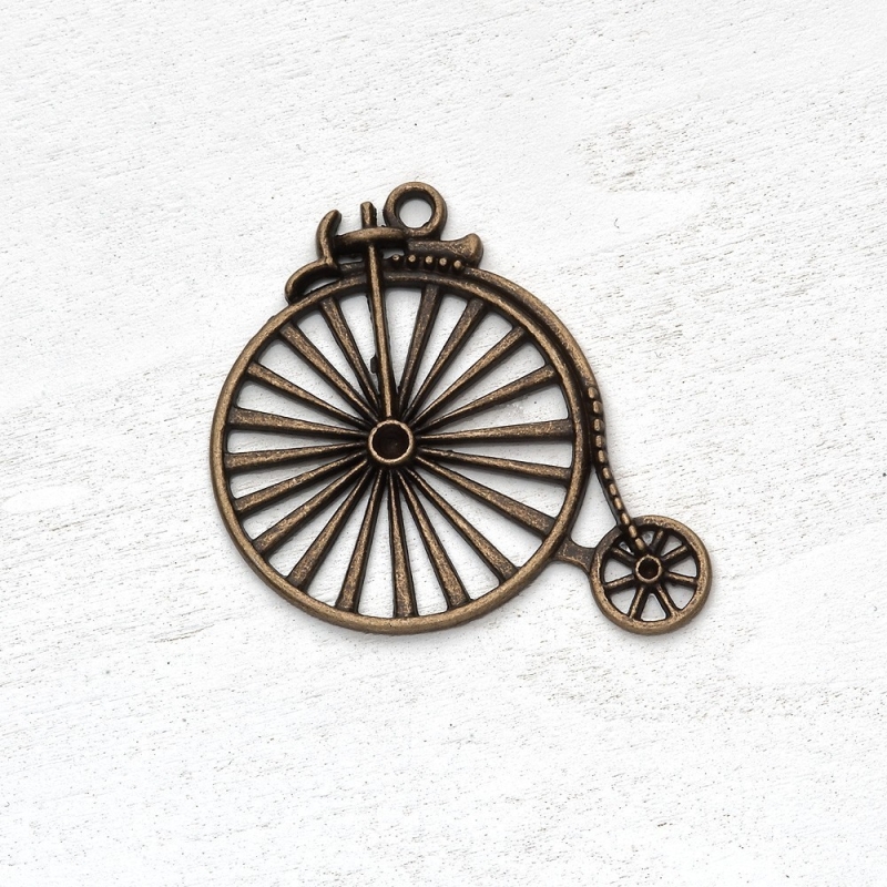 Μεταλλικό κρεμαστό διακοσμητικό ποδήλατο με μεγάλη ρόδα σε χρώμα bronze. Κατάλληλο για διακοσμήσεις και χειροποίητες κατασκευές. Η συσκευασία περιέχει 10 τεμάχια.