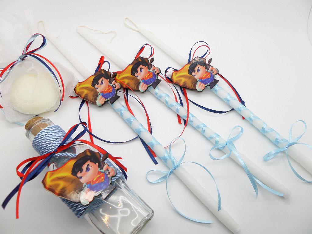 Σετ λαδικού με θέμα σούπερμαν το οποίο περιλαμβάνει 3 κεράκια για την κολυμπήθρα, σαπουνάκι και μπουκαλάκι για το λάδι. Μπορούν να γίνουν ότι φιγούρες θέλετε.