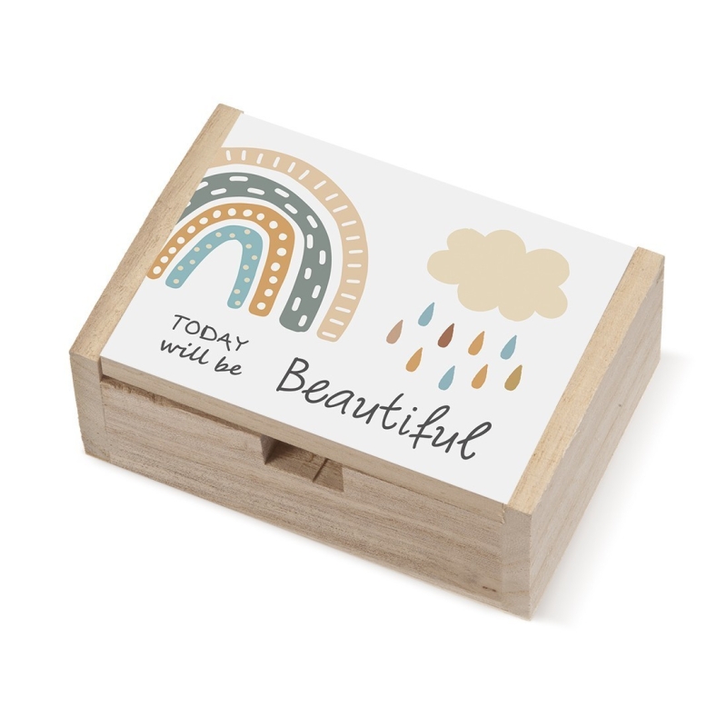 Ξύλινο natural παραλληλόγραμμο κουτί. Είναι διακοσμημένο με αυτοκόλλητο print ουράνιο τόξο γήινες αποχρώσεις.