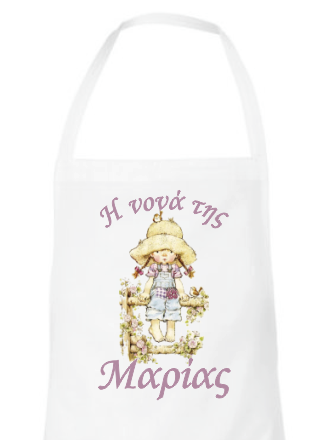 Λευκή ποδιά για το νονό ή τη νονά, εκτυπωμένη με θέμα "Sarah Kay". Γράψτε στα σχόλια μέσα στο καλάθι το όνομα του παιδιού σας.