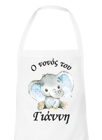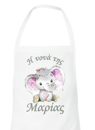 Λευκή ποδιά για το νονό ή τη νονά, εκτυπωμένη με θέμα "Ελεφαντάκι". Γράψτε στα σχόλια μέσα στο καλάθι το όνομα του παιδιού σας. Με σιέλ ή ροζ ελεφαντάκι.