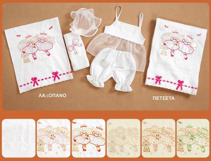Λαδόπανα με θέμα μπαλαρίνες ελληνικής κατασκευής άριστης ποιότητας σε διάφορες αποχρώσεις. Το σετ περιλαμβάνει πετσέτα μικρή και μεγάλη, σεντονάκι και σετ εσώρουχα.