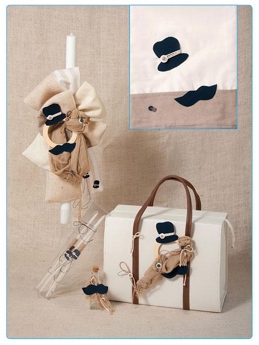 Σετ Βάπτισης με θέμα μουστάκι σε απόχρωση εκρού - καφέ. Το σετ περιλαμβάνει βαλίτσα δερματίνη, σετ λαδόπανα, λαμπάδα και σετ λαδικού όλα στολισμένα στο ίδιο θέμα.