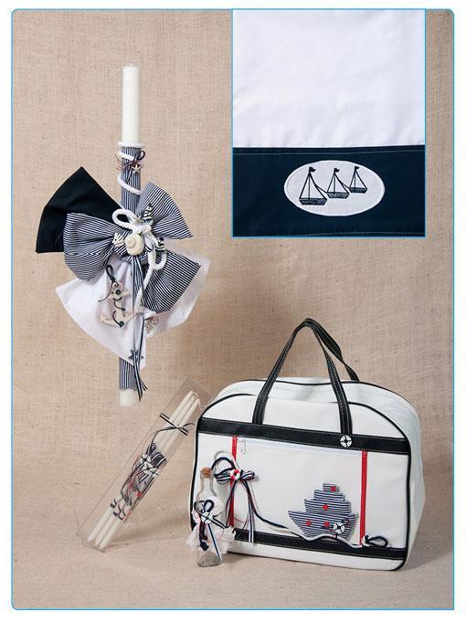 Σετ Βάπτισης καραβάκι σε απόχρωση λευκό - μπλε navy. Το σετ περιλαμβάνει βαλίτσα χειροποίητη, σετ λαδόπανα, λαμπάδα και σετ λαδικού όλα στολισμένα στο ίδιο θέμα.
