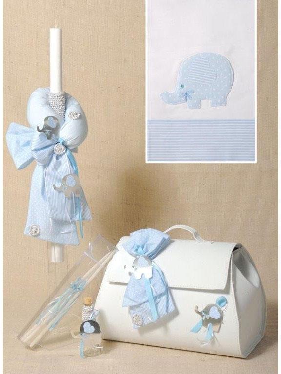 Σετ Βάπτισης ελεφαντάκι σε απόχρωση λευκό - σιέλ. Το σετ περιλαμβάνει βαλίτσα δερματίνη, σετ λαδόπανα, λαμπάδα και σετ λαδικού όλα στολισμένα στο ίδιο θέμα.
