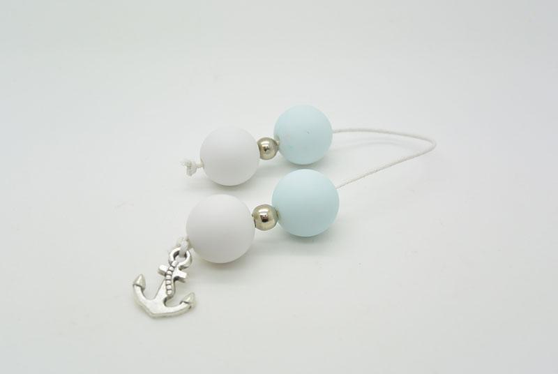 Μπεγλέρι Βάπτισης άγκυρα σε σιέλ - λευκό απόχρωση. Το ίδιο μπορεί να γίνει και σε ροζ. Η τιμή αφορά μόνο το μπεγλέρι, με επιπλέον χρέωση μπορεί να γίνει ολοκληρωμένη μπομπονιέρα. Η χάντρα έχει διάμετρο 1.6 εκ.