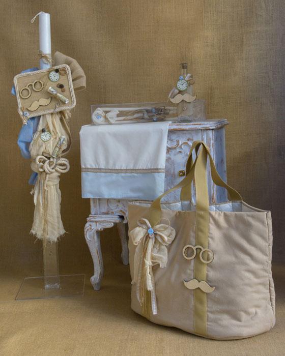 Σετ Βάπτισης μουστάκι. Το σετ περιλαμβάνει βαλίτσα χειροποίητη, σετ λαδόπανα, λαμπάδα και σετ λαδικού όλα στολισμένα στο ίδιο θέμα.