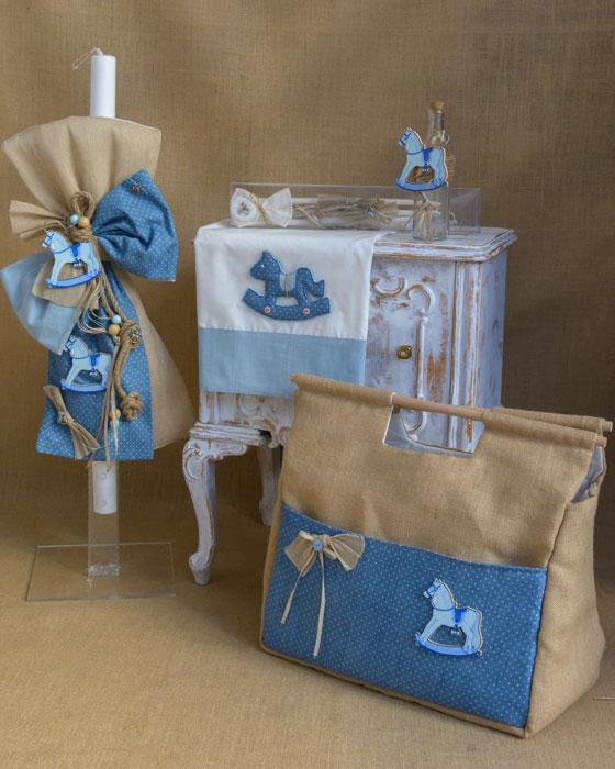 Σετ Βάπτισης αλογάκι. Το σετ περιλαμβάνει βαλίτσα χειροποίητη, σετ λαδόπανα, λαμπάδα και σετ λαδικού όλα στολισμένα στο ίδιο θέμα.