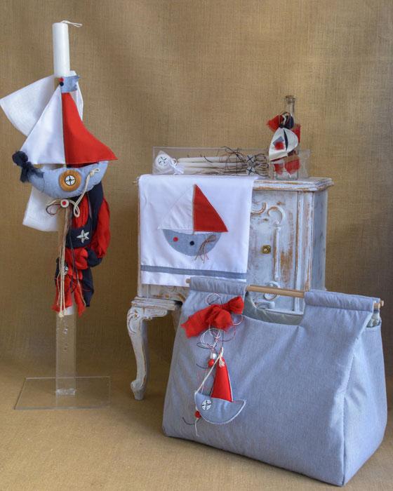 Σετ Βάπτισης καραβάκι. Το σετ περιλαμβάνει βαλίτσα χειροποίητη, σετ λαδόπανα, λαμπάδα και σετ λαδικού όλα στολισμένα στο ίδιο θέμα.