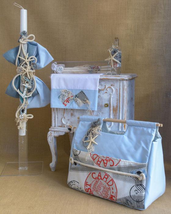 Σετ Βάπτισης θαλασσινό. Το σετ περιλαμβάνει βαλίτσα χειροποίητη, σετ λαδόπανα, λαμπάδα και σετ λαδικού όλα στολισμένα στο ίδιο θέμα.