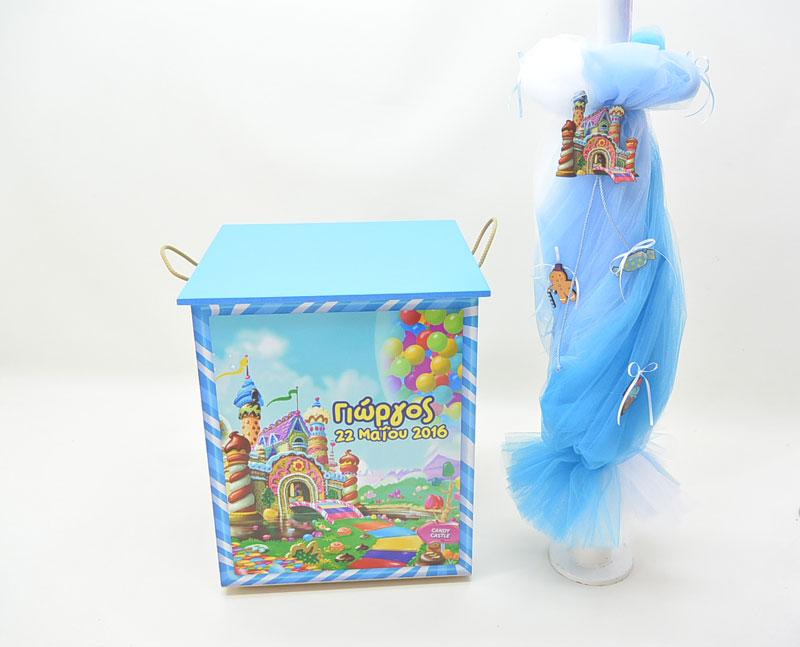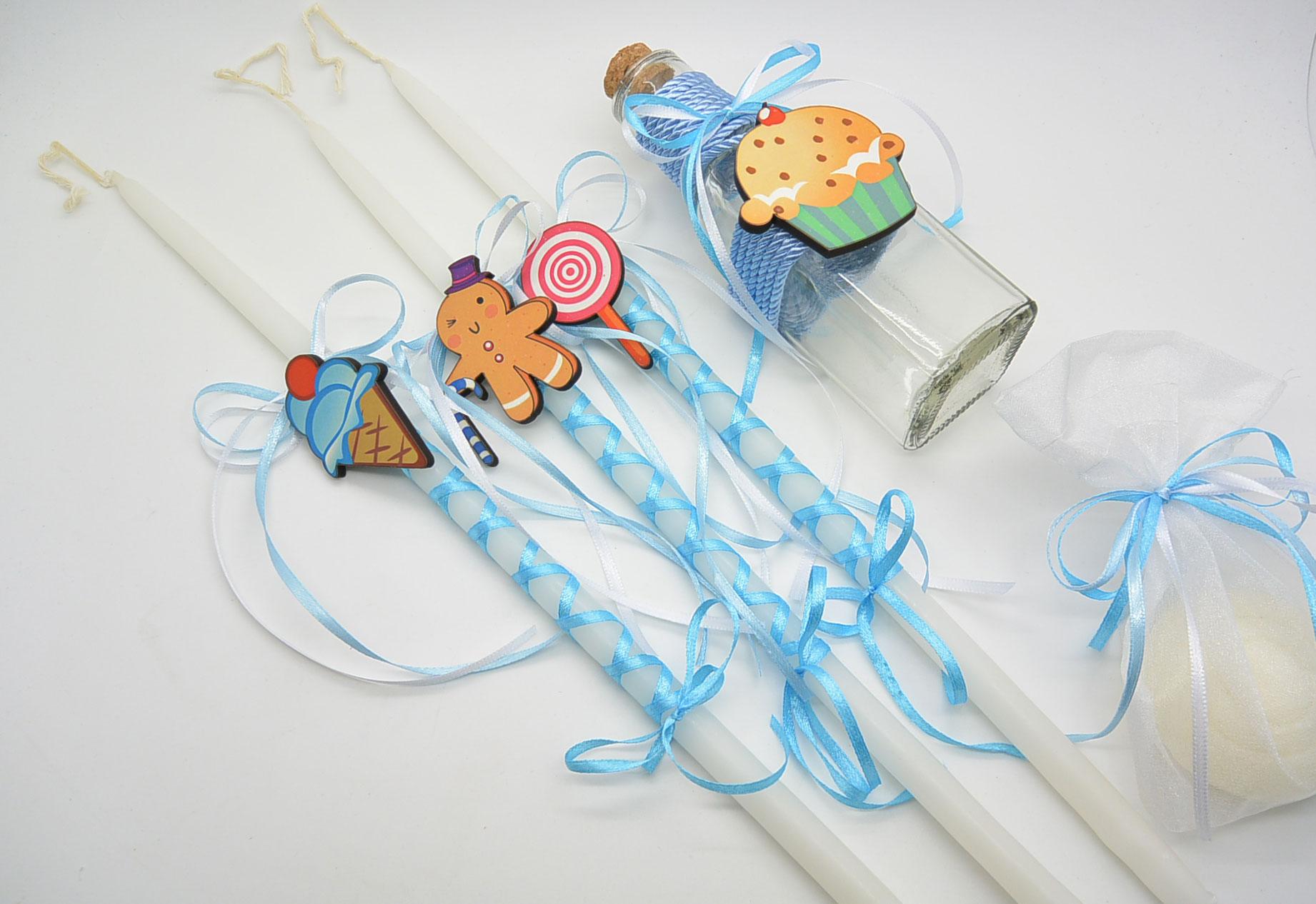 Σετ βάπτισης γλυκάκια το οποίο περιλαμβάνει κουτί βάπτισης, σετ λαδόπανα, σετ λαδικού και λαμπάδα στολισμένα όλα στο ίδιο θέμα.