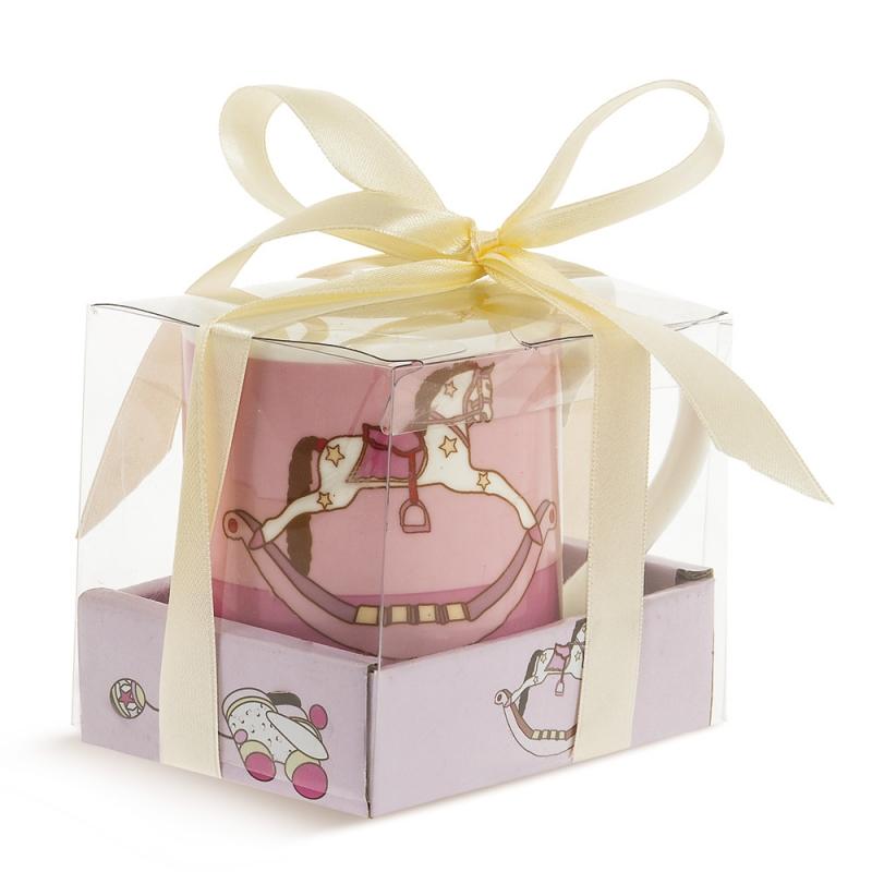 Μπομπονιέρα Βάπτισης κούπα αλογάκι από πορσελάνη. Διάσταση κούπας 7,4 x 8,5 cm και κουτιού 10 x 8 x 8,4 cm. Η τιμή αφορά δεμένη μπομπονιέρα με 5 κουφέτα αμυγδάλου ή 9 κουφετάκια smarties.
