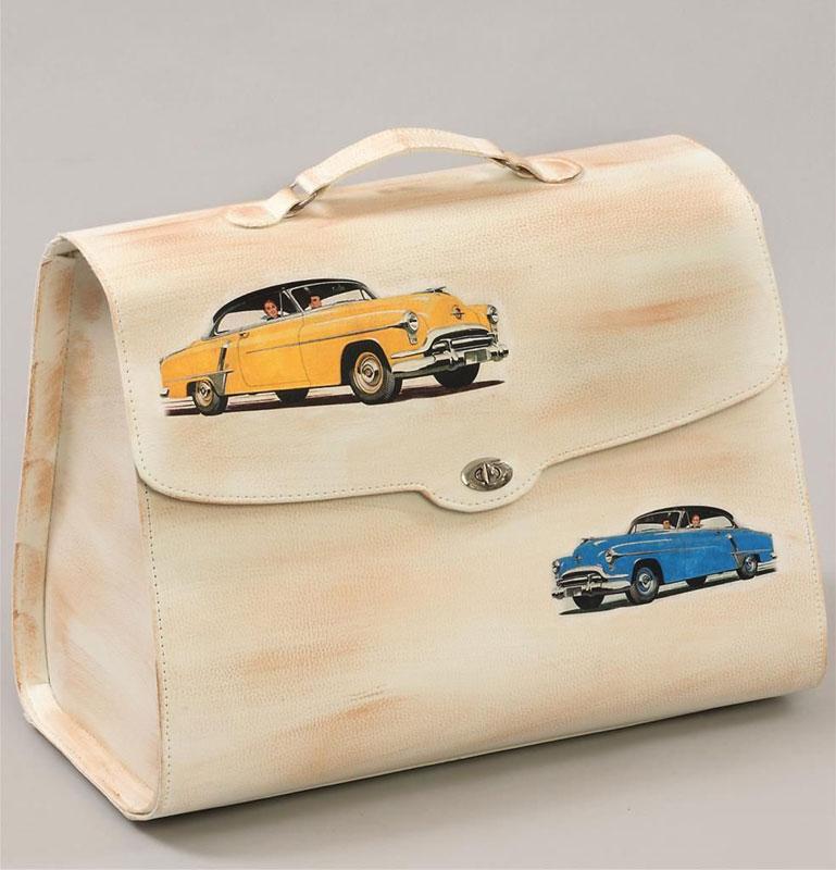 Τσάντα βάπτισης από δερματίνη με decoupage αυτοκίνητα. Διαστάσεις 47 x 32 x 37 cm.